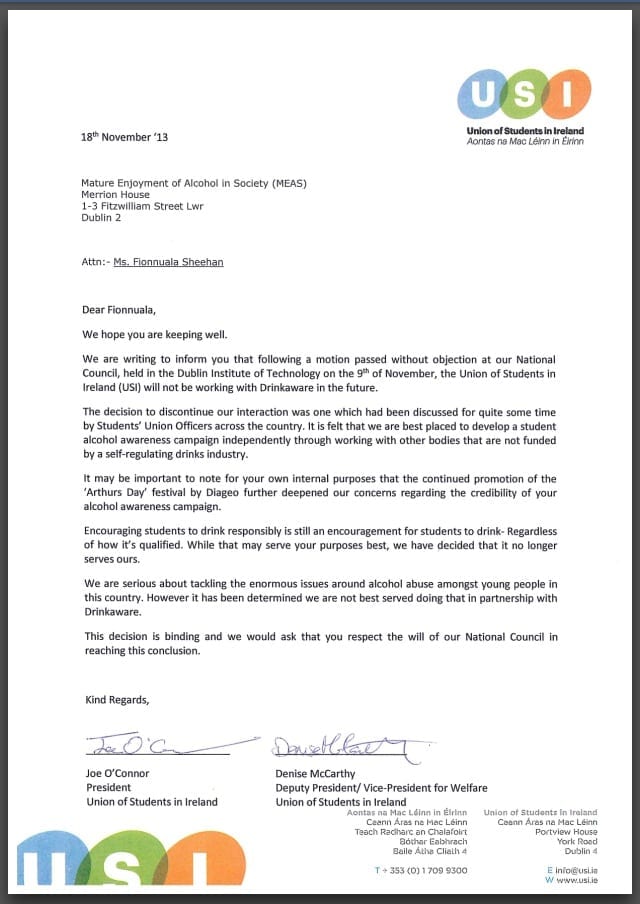 “We are serious about tackling the enormous issues around alcohol abuse amongst young people in this country. Abuse of alcohol can lead to mental and physical health problems amongst other issues. USI want to ensure that students’ health is at the forefront of any campaigns we run/support in the future. Accordingly, It has been determined we are not best served doing that in partnership with Drinkaware”.