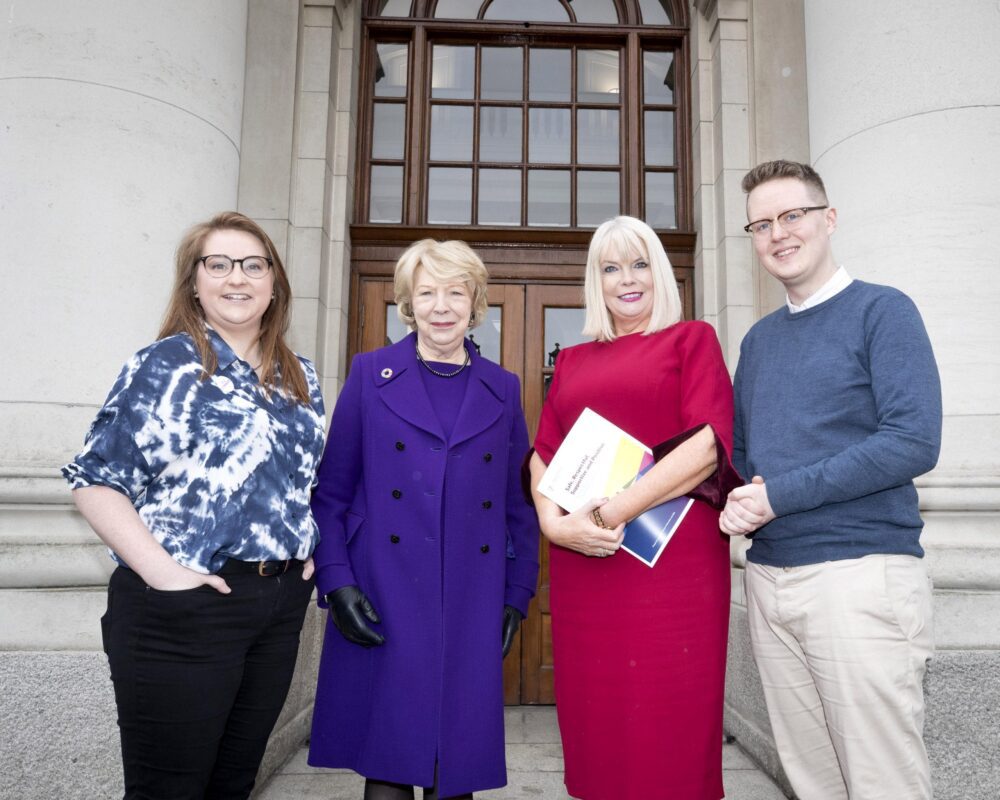 Damien McClean (VP Welfare, USI) with Dr Anne Looney (Former Interim CEO of the HEA, and current executive Dean of the Institute of Education, DCU), Minister for Education Mary Mitchell O’Connor and Síona Cahill (President of USI) pictured outside Government Buildings